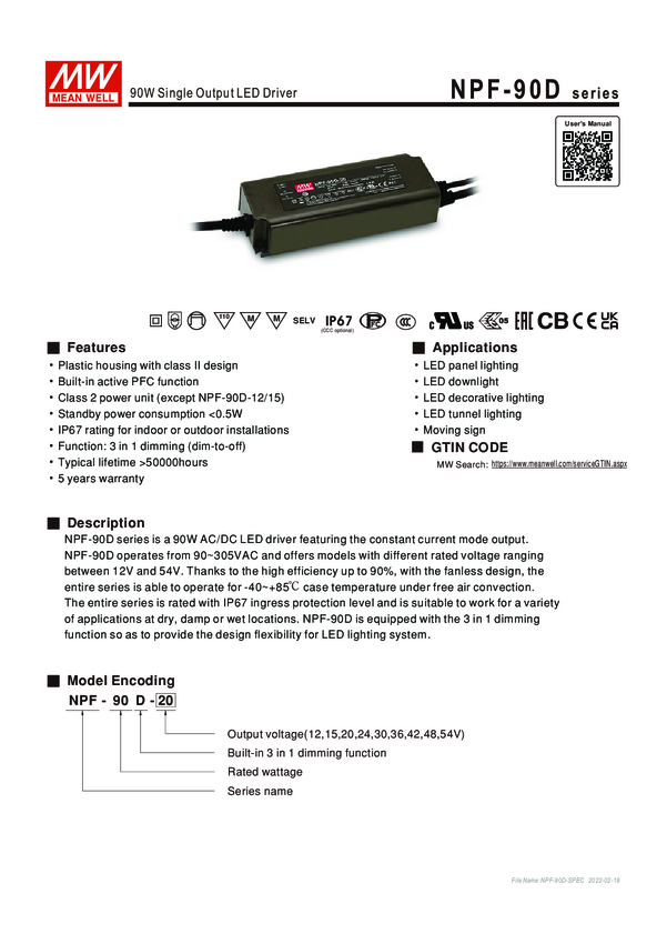 NPF-90D-20 MEAN WELL NPF-90D-20 Sterownik LED, Transformator LED Stałonapięciowy, Stał...