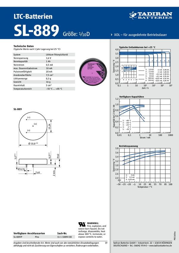 11 1 18894 00 Bateria 1/10 D Tadiran Batteries SL 889 P, 3.6 V, 1000 mAh, litowe, Pin...