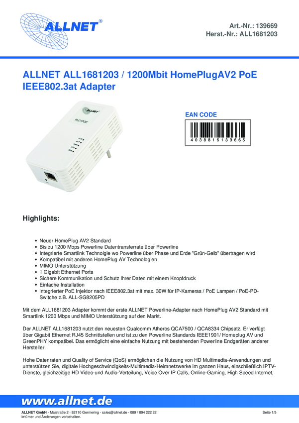ALL1681203 Allnet ALL1681203 Adapter Ethernet do sieci energetycznej, powerline ALL168...