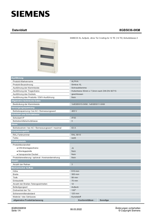 Siemens 8GB50360KM 8GB5036-0KM Szafka rozdzielcza nadbudowa Ilość modułów = 36 Ilość rzędów = 3 Content 1 szt.