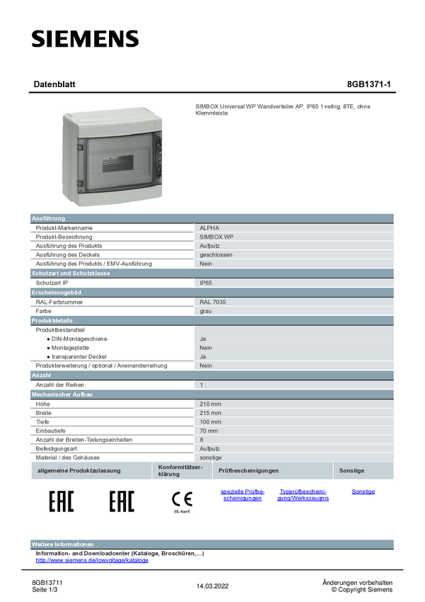 Siemens 8GB13711 8GB1371-1 Szafka rozdzielcza nadbudowa Ilość modułów = 8 Ilość rzędów = 1 Content 1 szt.