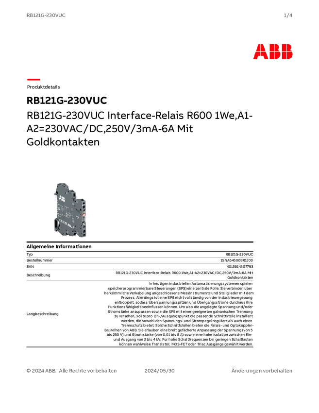 1SNA645008R1200 Przekaźnik interfejsowy ABB RB121G-230VUC 230 V 1 szt.