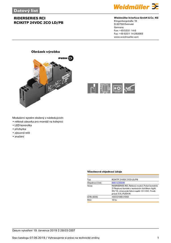 8897230000-1 Weidmüller RCIKITP 24VDC 2CO LD/PB Moduł przekaźnikowy Napięcie znamion...