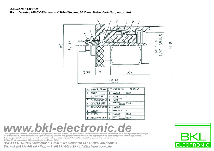 Adapter MMCX BKL Electronic 0416512 Wtyczka MMCX - złącze męskie SMA 1 szt.