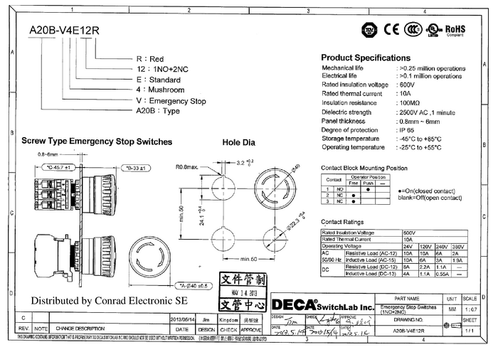 DECA 1233794 Wyłącznik awaryjny A20B-V4E12R, 240 V/AC, 1 NO, 2 NC, 1 szt.
