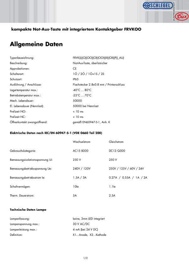 MBW_FRVKOO Schlegel MBW_FRVKOO Wyłącznik awaryjny w obudowie 250 V/AC 2 NC 1 szt.