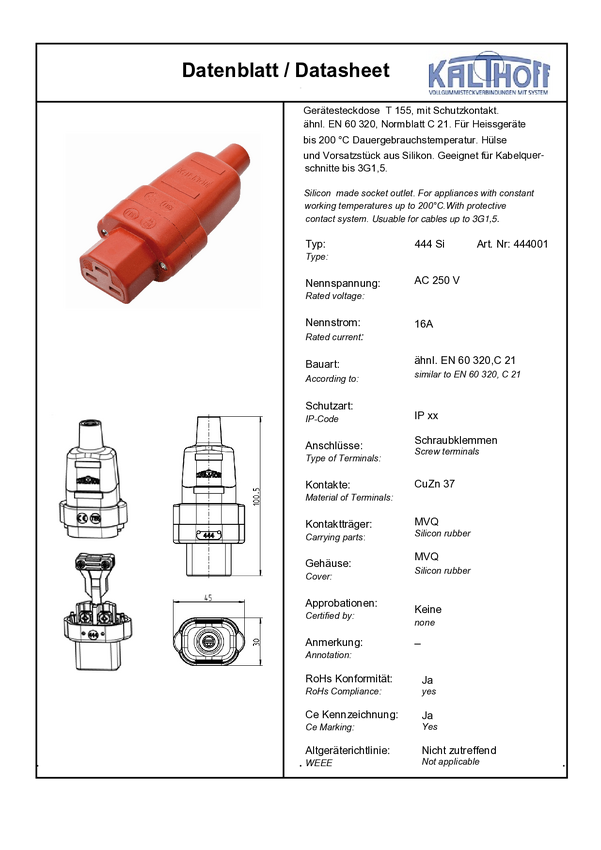 444001 Kalthoff 444001 Złącze męskie IEC 444, styki: 2 + PE, 250 V, 16 A, 1 szt.