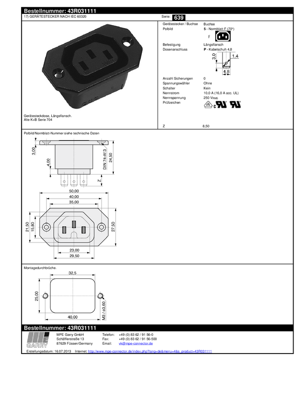 43R031111 złącze żeńskie do wbudowania pionowego C13 2 + PE 10 A czarny K & B 43R...