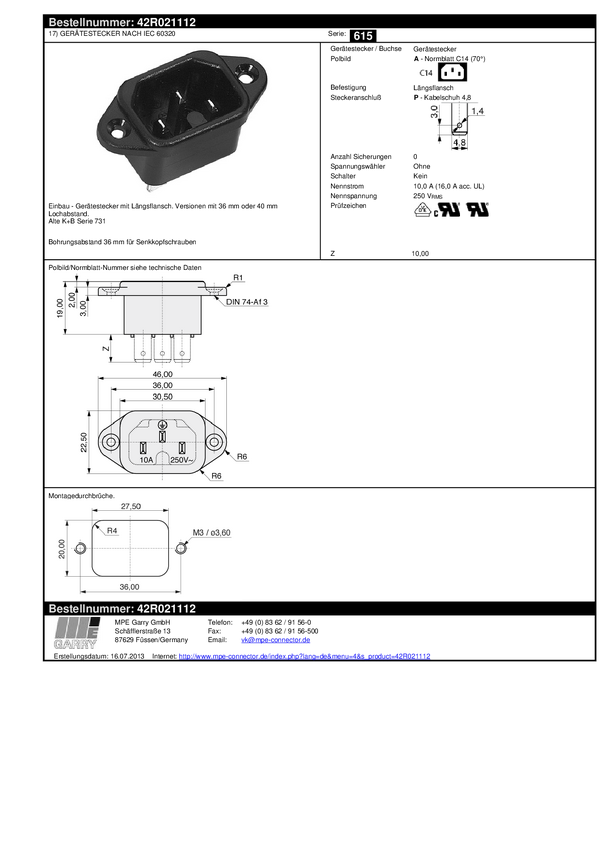 42R021112 złącze męskie do wbudowania pionowego C14 2 + PE 10 A czarny K & B 42R0...