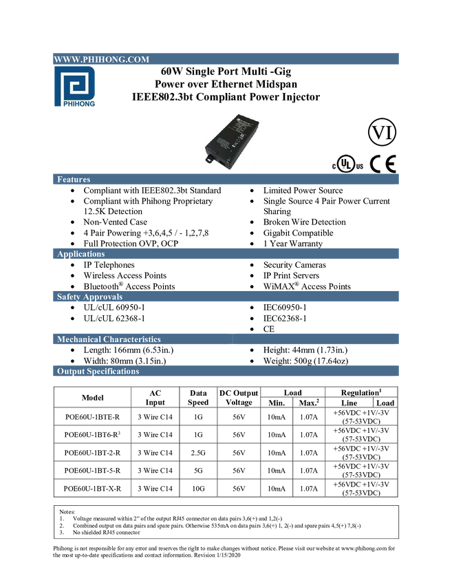 POE60U-1BTE Phihong POE60U-1BTE Injektor PoE IEEE 802.3af (12.95 W)