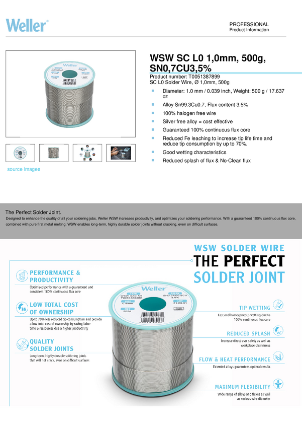T0051387899 Cyna lutownicza bezołowiowa Weller WSW SC L0 szpula Sn0,7Cu 500 g 1 mm