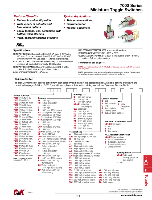 7101MCWCQE C & K Switches 7101MCWCQE Przełącznik dźwigienkowy, 1 x wł/wł, 120...