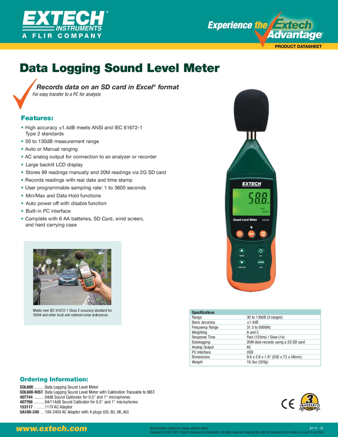 SDL600-ISO Decybelomierz Extech SDL600, 30 - 130 dB, 31.5 Hz - 8000 Hz, Kalibracja (IS...