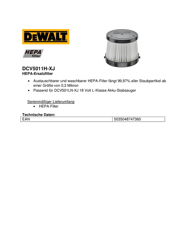 DCV5011H-XJ Wymienny filtr DEWALT DCV5011H-XJ 1 szt.