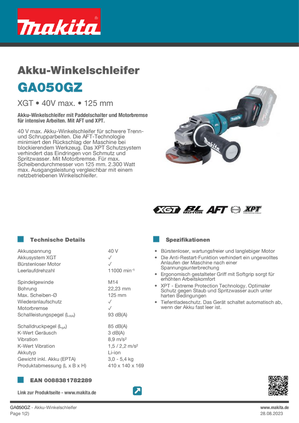 GA050GZ Akumulatorowa szlifierka kątowa Makita GA050GZ 2300 W