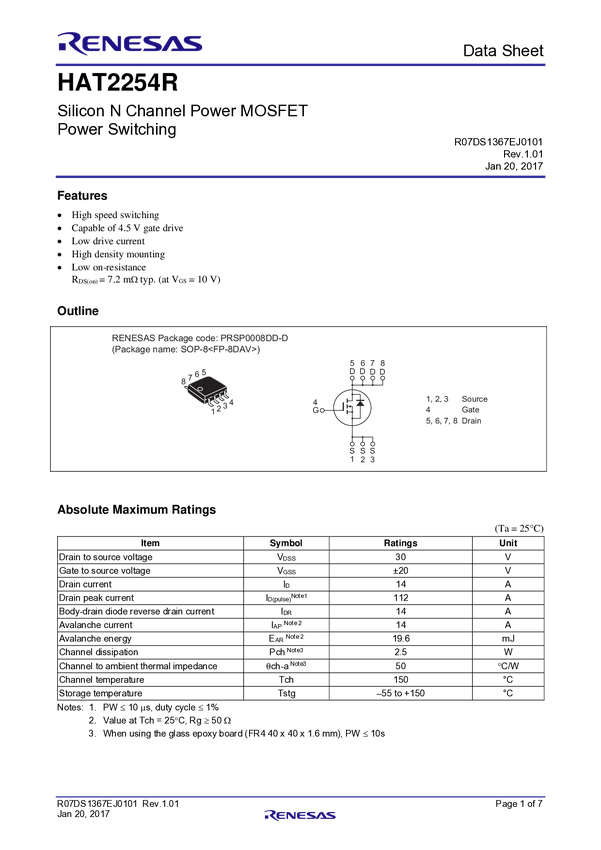 HAT2254R-EL-E Nch Single Power Mosfet 30V 14A 9Mohm Sop8