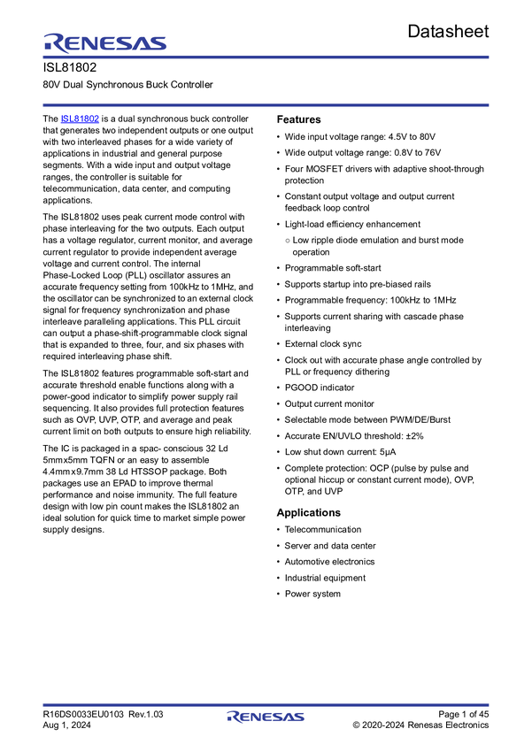 ISL81802FVEZ-T7A 80V Dual Synchronous Buck Controller