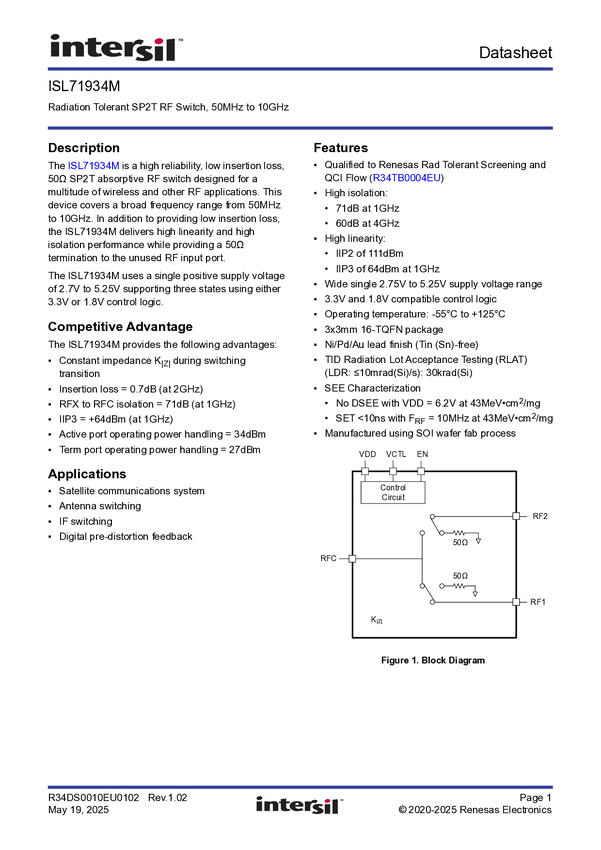 ISL71934MRTZ Radiation Tolerant 10GHz SPDT RF Switch