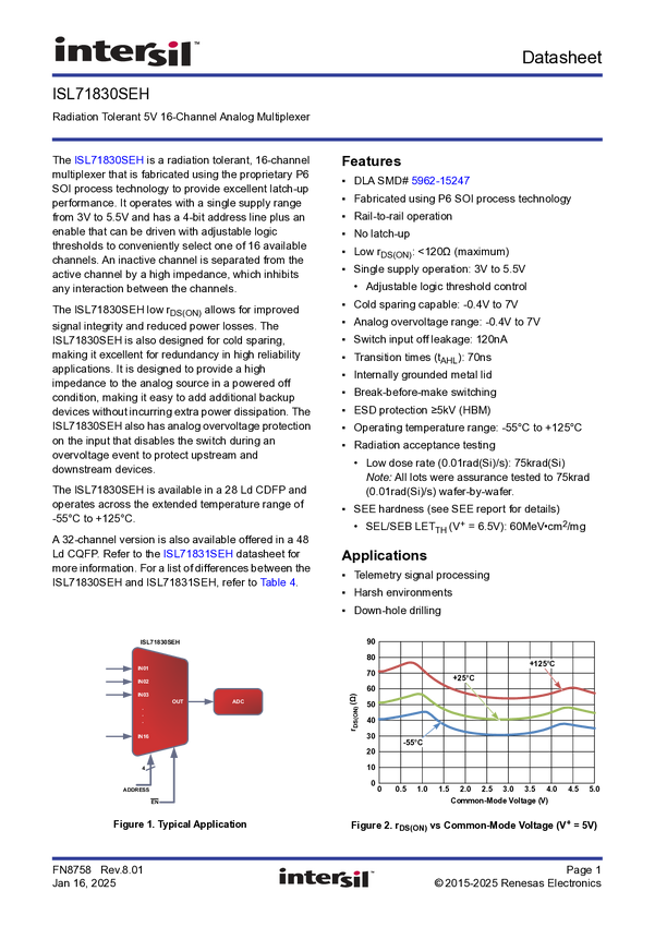 ISL71830SEHX/SAMPLE Radiation Tolerant 5V 16-Channel Analog Multiplexer
