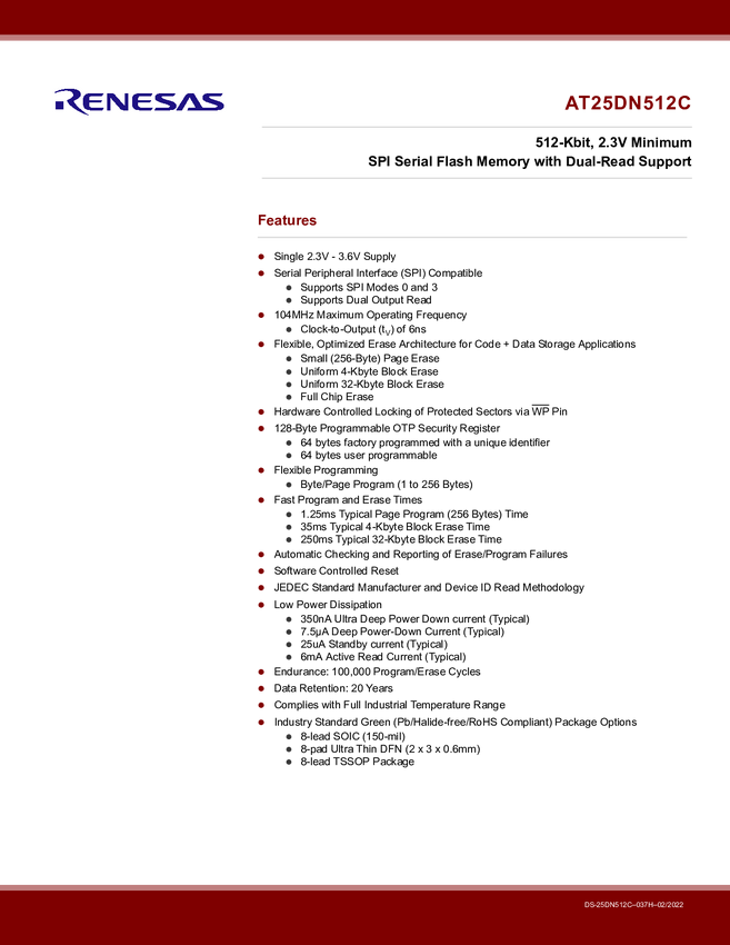 512Kbit, 2.3V to 3.6V Range SPI Serial Flash Memory with Dual-Read Support