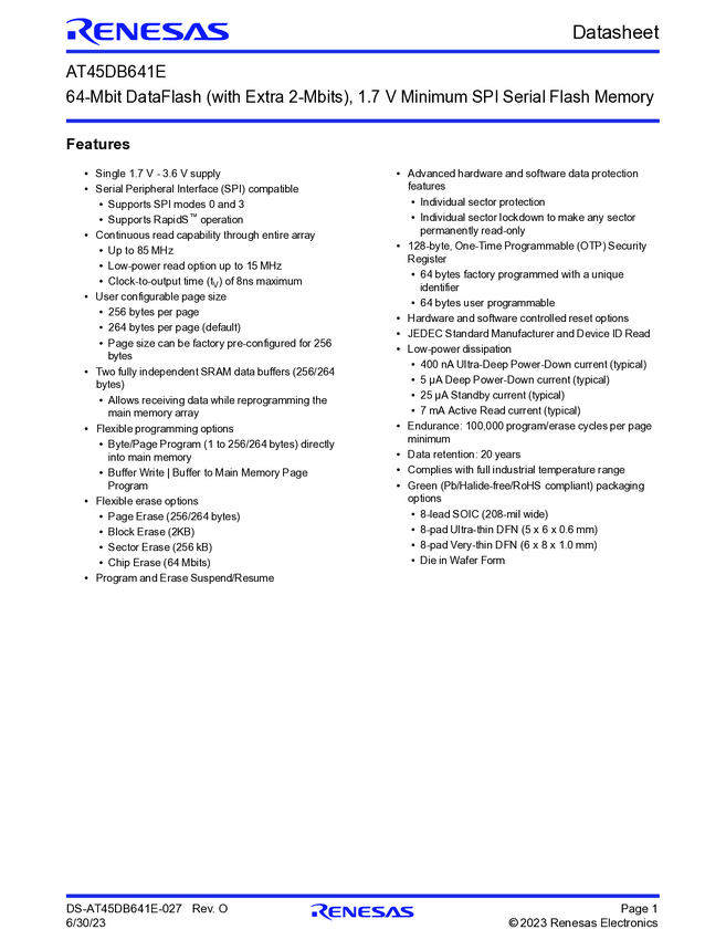 - AT45DB641E, AT45DB641E-MHN2B-T, AT45DB641E-MHN-T, AT45DB641E-MHN-Y, AT45DB641E-MWHN2B-T, AT45DB641E-MWHN-T, AT45DB641E-MWHN-Y, AT45DB641E-SHN-B, AT45DB641E-SHN-T, AT45DB641E-UUN2B-T, AT45DB641E-UUN-T