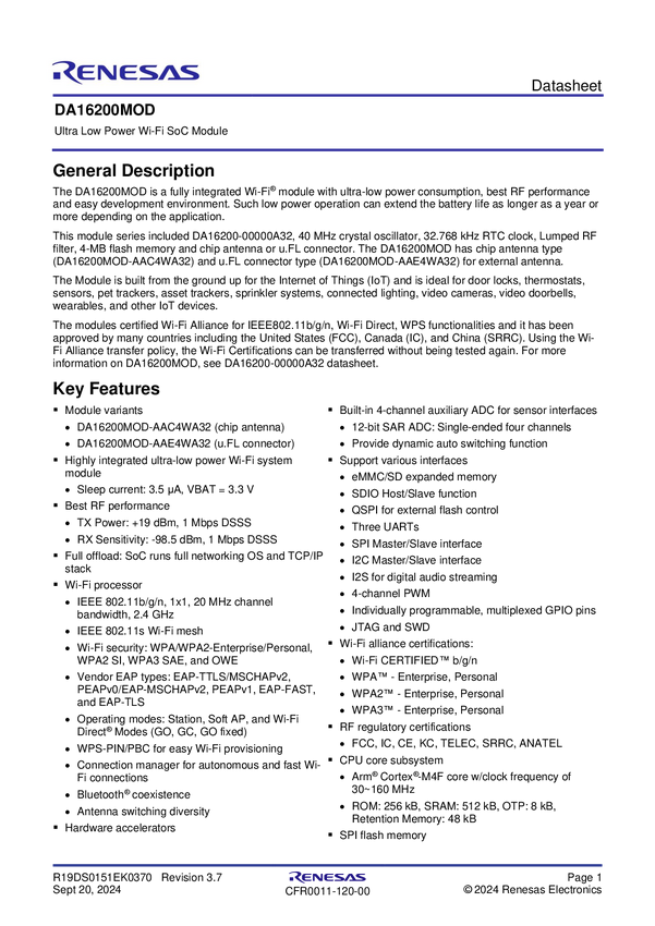 DA16200MOD-AAC4WA32 Ultra-Low Power Wi-Fi Modules for Battery Powered IoT Devices