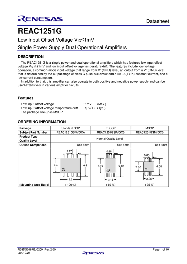 REAC1251GSP#GC0 Low Input Offset Voltage VIO≤1mV Single Power Supply Dual Operational Ampli...