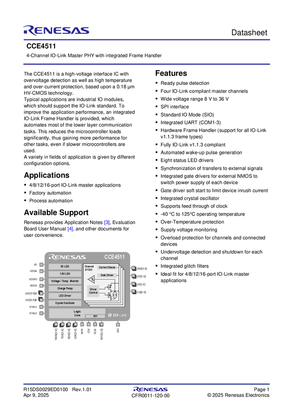 CCE4511CA 4-Channel IO-Link Master Transceiver with Integrated Frame Handler