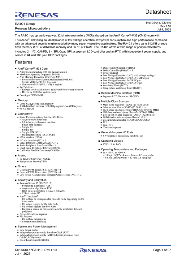 RA4C1 80MHz Arm Cortex-M33 Based Low-Power MCU with TrustZone, Segment LCD Contro...