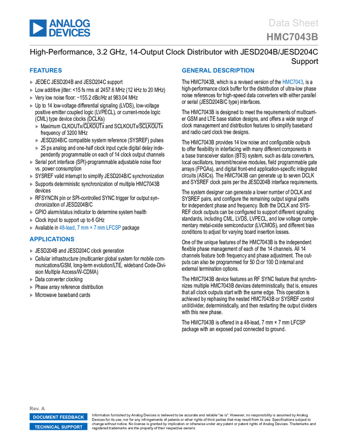 HMC7043B High-Performance, 3.2 GHz, 14-Output Clock Distributor with JESD204B/JESD20...