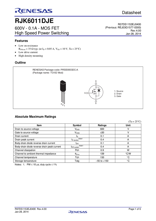 RJK6011DJE Nch Single Power Mosfet 600V 0.1A 52000Mohm To-92 Mod