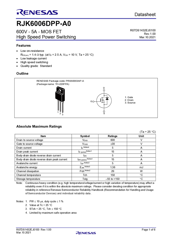RJK6006DPP-A0 Nch Power MOSFET 600V 5A 1600mohm TO-220F
