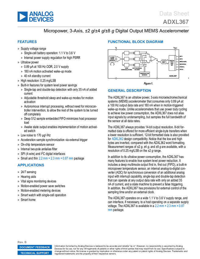 ADXL367 Nanopower, 3-Axis, ±2 /±4 /±8 Digital Output MEMS Accelerometer