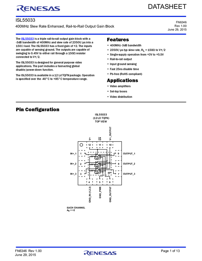 ISL55033 400MHz Slew Rate Enhanced Rail-to-Rail Output Gain Block