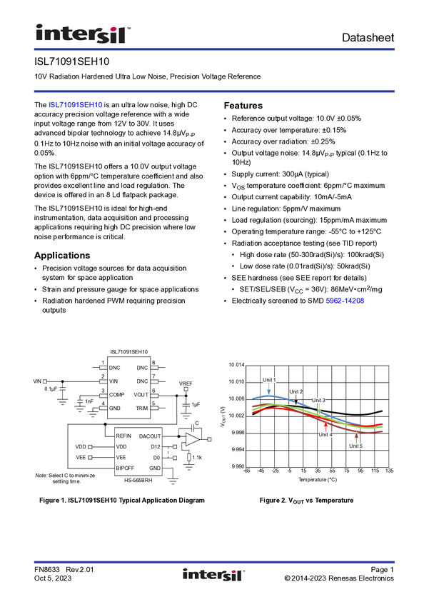 ISL71091SEH10 10V Radiation Hardened Ultra Low Noise, Precision Voltage Reference