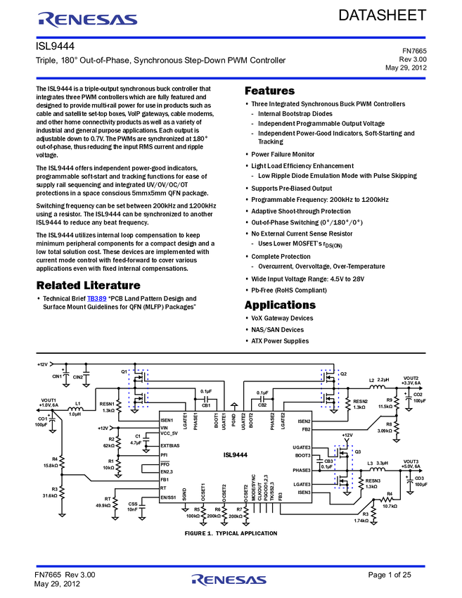 ISL9444 Triple, 180° Out-of-Phase, Synchronous Step-Down PWM Controller