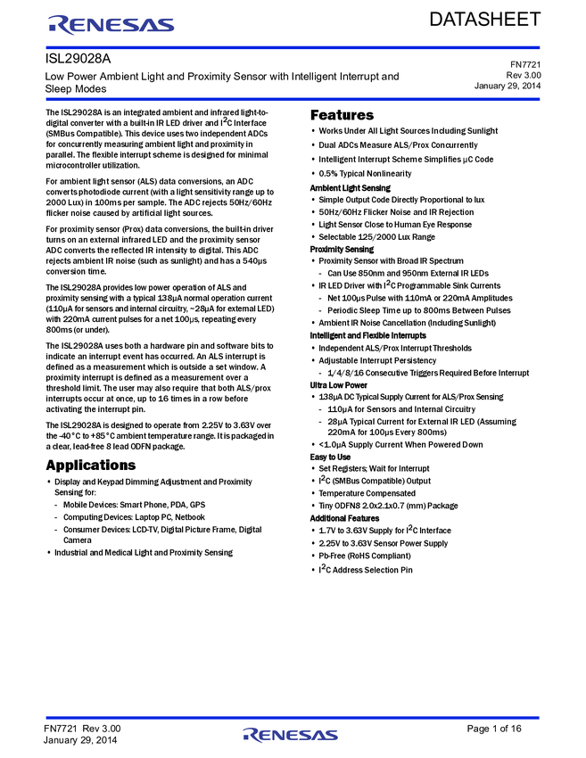 ISL29028A Low Power Ambient Light and Proximity Sensor with Intelligent Interrupt and...