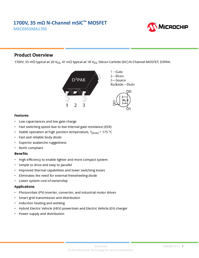 MSC035SMA170S 1700V, 35 mOhm mSiC™ MOSFET D3PAK Datasheet