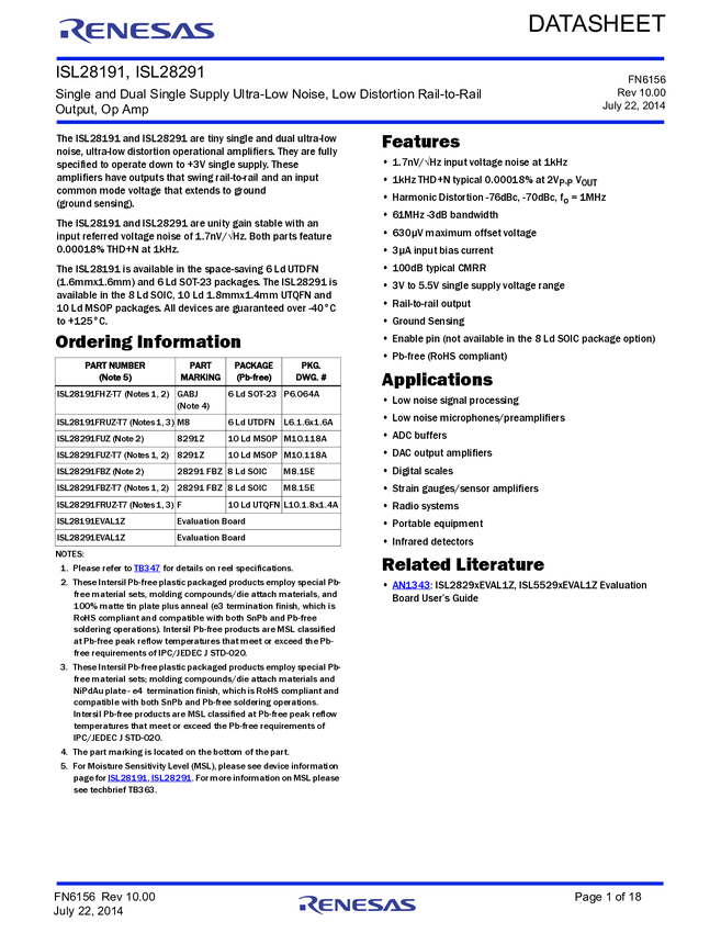ISL28291FBZ, ISL28291FBZ-T7, ISL28291FRUZ-T7, ISL28291FUZ, ISL28291FUZ-T7