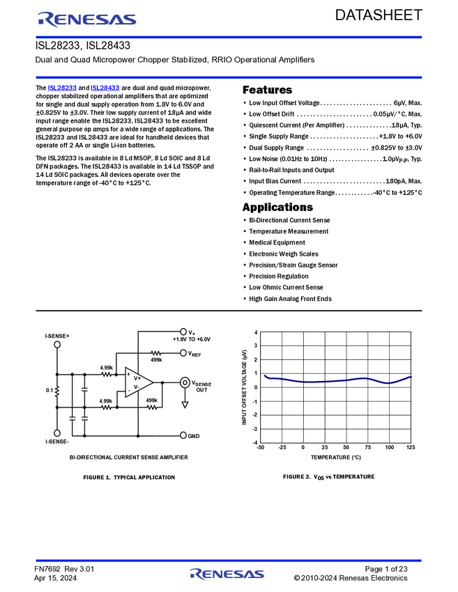 ISL28433 Quad Micropower, Chopper Stabilized, RRIO Operational Amplifier