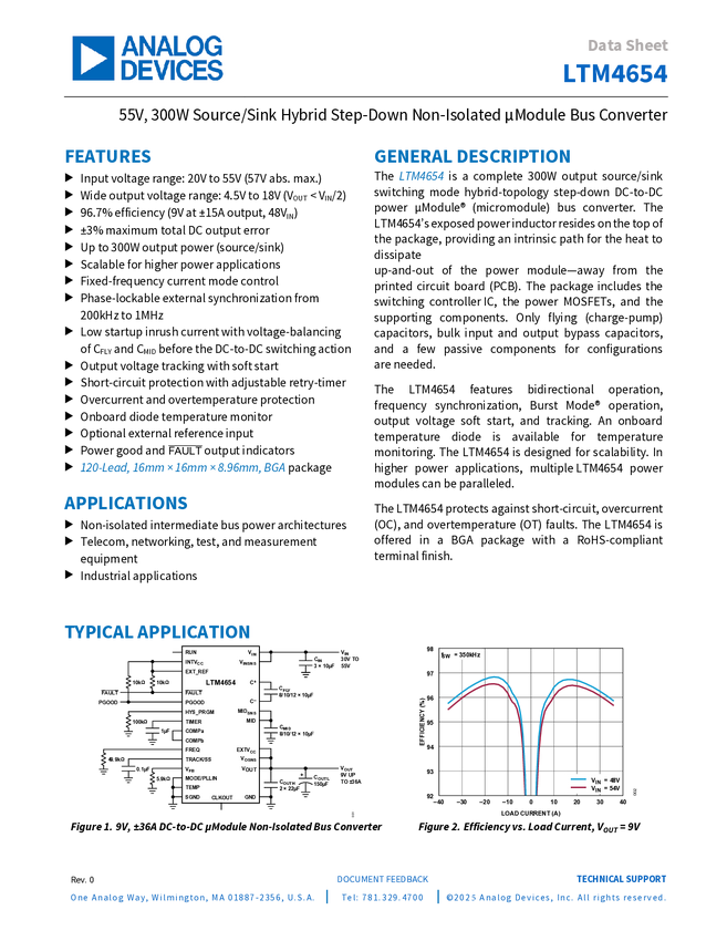 LTM4654 55V, 300W Source/Sink Hybrid Step-Down Non-Isolated μModule Bus Converter