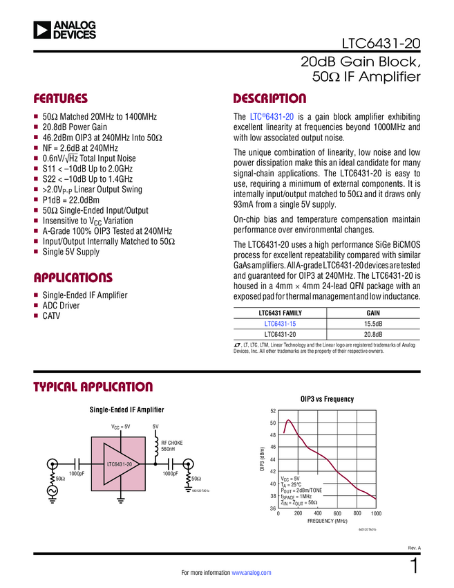 LTC6431-20 20dB Gain Block, 50Ω IF Amplifier