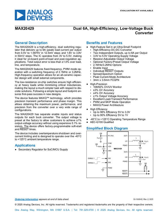 MAX20429 Dual 6A, High-Efficiency, Low-Voltage Buck Converter