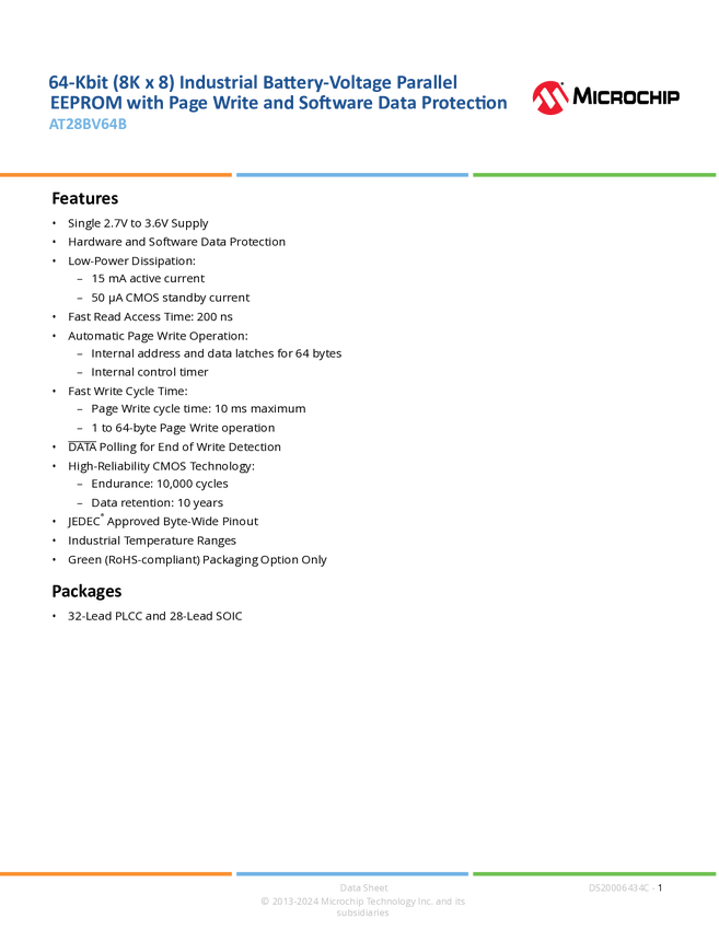 AT28BV64B 64-Kbit (8K x 8) Industrial Battery-Voltage Parallel EEPROM with Page Write...