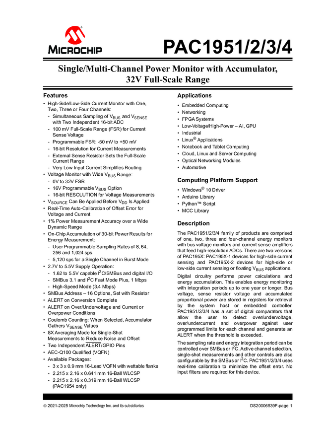 PAC1952 PAC1951/2/3/4 - Single/Multi-Channel Power Monitor with Accumulator, 32V Fu...