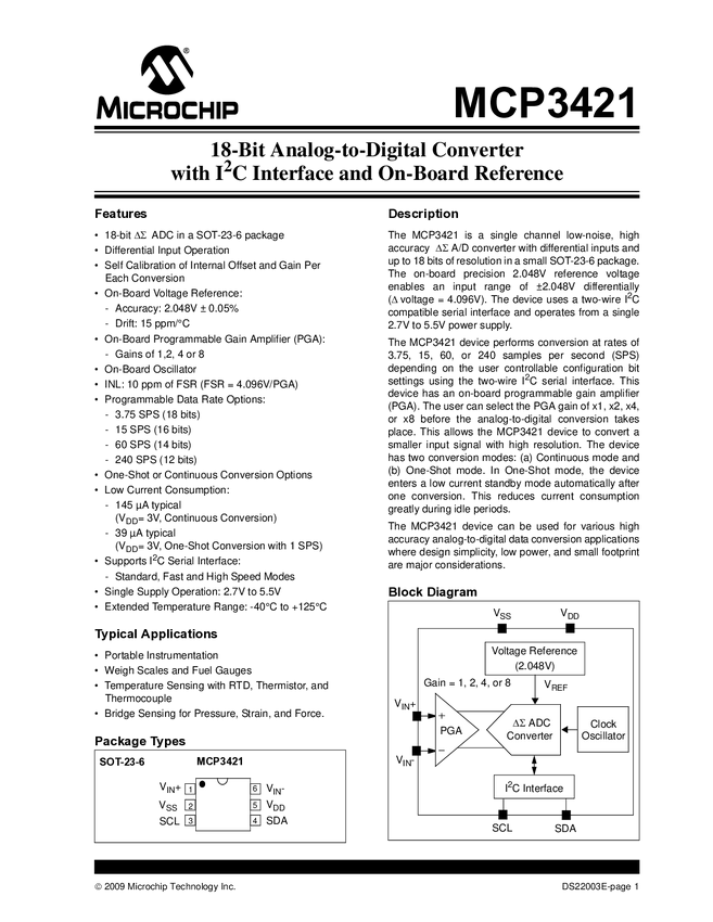 MCP3421 18-Bit ADC with I2C Interface and Onboard Reference
