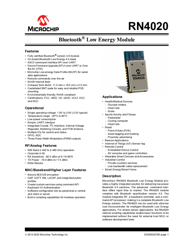 RN4020-Bluetooth® Low Energy Module Data Sheet