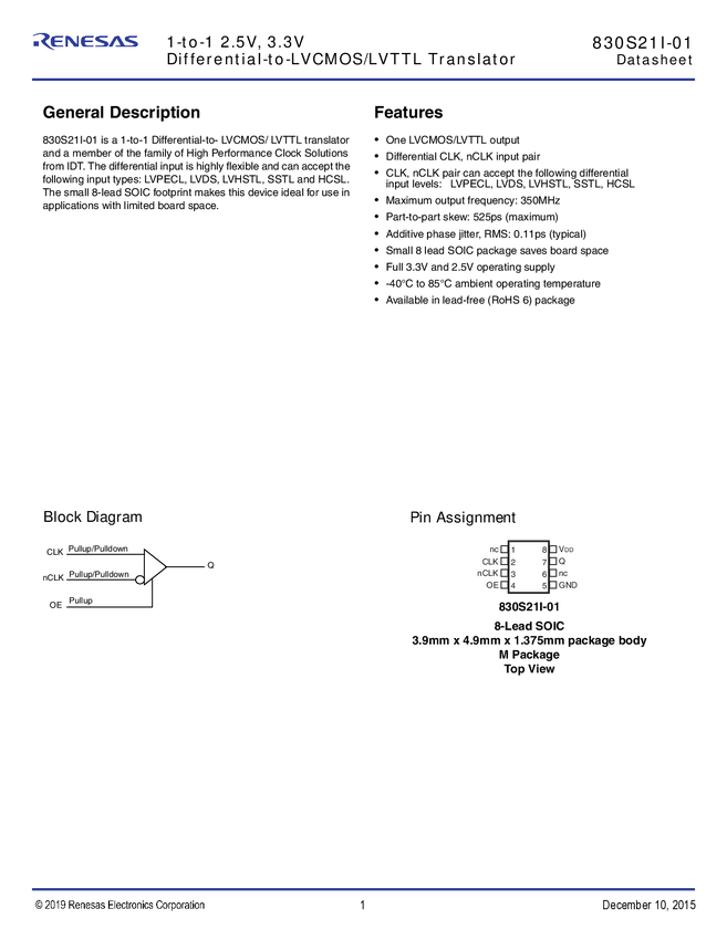 1-to-1,2.5V,3.3V Differential-to-LVCMOS/LVTTL Translator