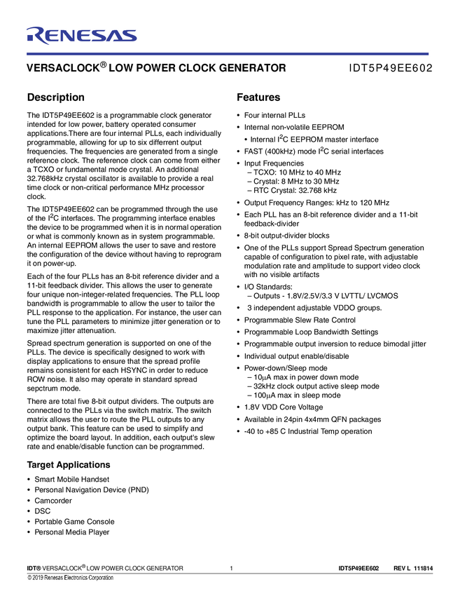 5P49EE602NLGI VersaClock Low Power Clock Generator