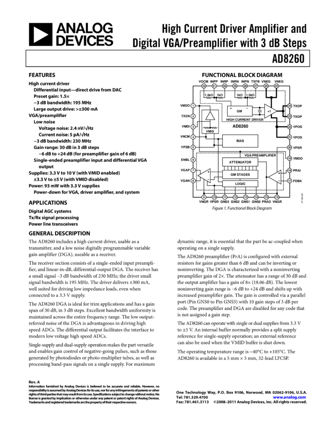 AD8260: High Current Driver Amplifier and Digital VGA/Preamplifier with 3 B Steps